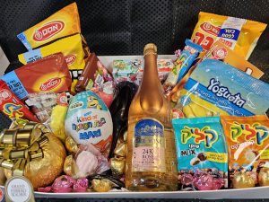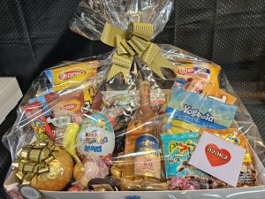 מארז מיכל עם שפע ממתקים בקבוק יין וכוס יין
