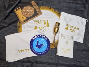 כיסוי למצה מודפס , הגדה , צלחת שוקולד ממולא, כוס ממותגת יש אפשרות להחלפה בכוס קידוש ,מגבת לברכה, שקית אפיקומן,